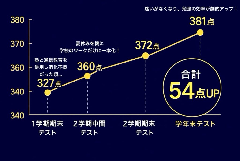 その結果、わずか7ヶ月で定期テストの5教科の合計点(500点満点)は54点アップ! 一度も下がることなく右肩上がりで成績が伸び続けました。
